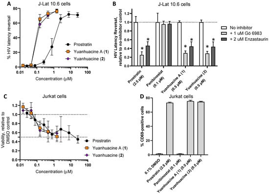 Compounds 1 and 2 (as an isomeric mixture) were investigated for their ability to reverse HIV latency using J-Lat T cells (clone 10.6) obtained from the NIH AIDS Reagent Program, Division of AIDS, NIAID, NIH (contributed by Dr. Eric Verdin) [21]. Cells were cultured in R10+ media [RPMI 1640 with HEPES and L-Glutamine, 10% Fetal Bovine Serum (FBS), 100 U of penicillin/mL, and 100 μg of streptomycin/mL (Sigma-Aldrich, St. Louis, MO, USA) and incubated at 37 °C and 5% CO2. Prostratin and Gö 6983 were purchased from Sigma-Aldrich. Enzastaurin was purchased from Sellick Chemicals GmbH through ThermoFisher (Waltham, MA, USA).