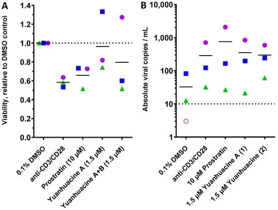 Effects of 10 μM prostratin and 1.5 μM of yuanhuacine A (1) or yuanhuacine (as an isomeric mixture) (2) on cell viability (A) and absolute viral RNA copies/mL of supernatant (B) in primary CD4+ cultures from 3 cART-suppressed donors with HIV following 24 h treatment. For both panels, shapes, and colors denote individual donors. In panel (B), the dotted line denotes limit of detection, and empty shape denotes no viral RNA detected.