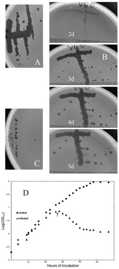 Lytic properties of viral isolates. Panels (A–C): Plaque formation. Suspensions of virions were streaked over the surface of overlays containing cells of strain K00 16-4. All photographs have the same scale, as indicated by the mm ruling. Panel (A): V3 at 3 days incubation; panel (B): V60 at the indicated days of incubation; panel (C): V65 at 3 days incubation; panel (D): infection in liquid. A growing culture of host strain K00 16-4 was diluted into fresh dextrin-tryptone medium to yield 2 × 108 cells in a total volume of 88 mL; this mixture was then divided equally between two 250 mL Erlenmeyer flasks. The resulting duplicate cultures were aerated by swirling at 150 rpm, and 1 mL aliquots were withdrawn at the times indicated. Turbidity was measured in 1 cm cuvettes and samples were diluted by a defined ratio with Sdil when necessary to ensure proportionality between turbidity and cell density (i.e., OD600 < 0.2). To start the infection, 3 × 109 PFU of isolate V60 was added at the time indicated by the arrows, yielding a calculated MOI of 7.