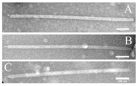In overlay plates, initially turbid plaques became transparent and continued to enlarge as incubation continued (Figure 1A–C). In liquid cultures, exponential growth stopped soon after infection and turbidity declined steadily to low levels (Figure 1D). Lysates typically had visible stringy or clumped debris, with titers ranging from 107 to 109 PFU per mL. Thus, the viruses we examined had impacts on S. islandicus cultures similar to those of lytic bacteriophages on their bacterial hosts. EM of negatively stained lysates of the three isolates (see Section 2) revealed large numbers of straight, rod-shaped particles 900–950 nm long and approximately 28 nm in diameter (Figure 2A–C). For all three isolates, virion precipitation, DNA extraction, and restriction endonuclease digestion yielded various patterns of DNA fragments, the lengths of which totaled 35–36 kbp. In addition, pairs of viral restriction fragments were observed to survive heat-denaturation and rapid cooling, which was not observed for any restriction fragments of control DNA (Figure S1 lanes B vs. D).