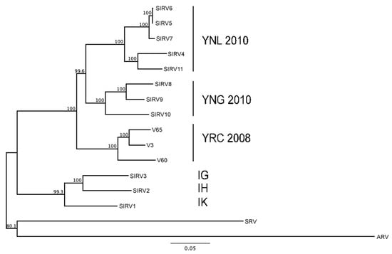 Relatedness of viral isolates. Genome sequences of the indicated viruses were analyzed by progressive MAUVE (see Section 2). Abbreviations: ARV, Acidianus Rod-shaped Virus 1 (NC_009965.1); SRV, Stygiolobus Rod-shaped Virus (NC_025375.1). GenBank accession numbers for SIRV1–11 are NC_004087.1, NC_004086.1, NC_030884, KY744231, KY744233, KY744235, KY744232, KY744229, KY744228, KY744230, and KY744234, respectively. Geographical regions are indicated as follows: YNL, Yellowstone National Park (Nymph Lake); YNG, Yellowstone National Park (Norris Geyser Basin); YRC, Yellowstone National Park (Rabbit Creek); IG, Iceland (Gunnuhver); IH, Iceland (Hveragerdi); IK, Iceland (Kverkjoll). If known, the year of isolation is also shown with location; for additional details, see Table 1.