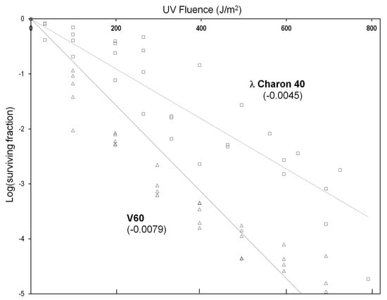 To characterize the ability of the virion structure to stabilize viral DNA, we compared isolate V60 (36 kbp) to the non-lysogenic bacteriophage λ construct Charon 40 (48 kbp) with respect to inactivation by UV-C radiation (see Section 2). As shown in Figure 4, survival of both viruses exhibited approximately exponential decay with respect to UV dose, although V60 exhibited a slightly biphasic survival curve. The apparent first-order dose coefficient for inactivation was at least 1.75 times greater for V60 than for λ, corresponding to approximately 2.4-fold higher UV sensitivity when normalized for genome length.
