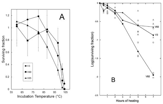 One-hour exposure to temperatures up to 102 °C allowed thermostability of isolates to be compared (Figure 5A). Based on the results, time-course experiments were used to measure rates of inactivation at a temperature of about 100 °C. Decay rates appeared to vary among the three isolates tested (Figure 5B), but in all cases were much less than those of the most thermostable of 115 Thermus thermophilus bacteriophage isolates evaluated by Yu et al. []. To confirm that differences in decay rates did not simply reflect variation among individual lysates, independent lysates of each isolate were assayed for survival after 7 h (Table S3). Although survival values varied among individual lysates, chi-square tests confirmed differences among the three viral strains (Table S3), identifying V60 as the least thermostable and V3 as the most thermostable under these conditions.