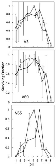 To measure stability as a function of pH, concentrated virion suspensions were diluted into various pH buffers and incubated 1 h at 70 °C, followed by cooling, further dilution in Sulfolobus dilution buffer (Sdil), and enumeration of PFU by plaque assay. The results (Figure 6) indicate that maximal virion stability was retained under mildly acidic conditions, i.e., pH 4–6. The chemical composition of the buffer mixture had limited influence on stability, as indicated by the closed vs. open symbols in panels of Figure 6, whereas the overall profiles of pH-dependence of stability tended to distinguish V65 from V3 and V60 (Figure 6).