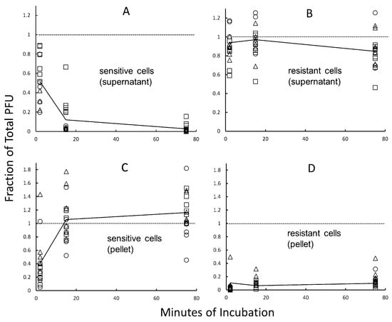 To characterize the cellular basis of the acquired resistance more directly, we tested the ability of sensitive and resistant strains to bind infective virions. As described in Section 2, virions were added to a numerical excess of cells and incubated at a physiological temperature (70 °C). At multiple time points, each mixture was diluted in cold buffer to retard further adsorption, and was centrifuged to separate cell-bound forms of the virus from free (unadsorbed) virions. These two forms were then quantified separately by sampling and plaque-assay of supernatant and washed-pellet fractions. The unfractionated mixtures (and fractions of a control tube without cells) provided estimates of the total (and background) PFU at each time point (see Section 2).