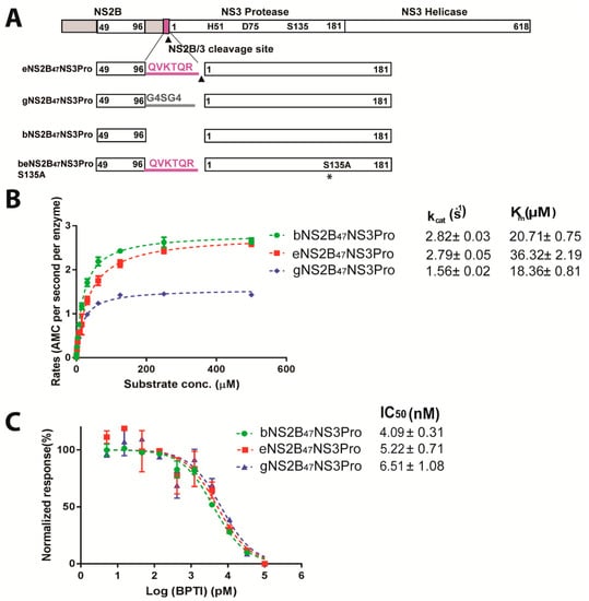 Schematic of construct design and characterization of protease activity from three different DENV4 NS2B47NS3 proteases. (A) Schematic of construct design of DENV4 NS2B47NS3Pro with three different linkers, e, g and b-. The beNS2B47NS3Pro S135A was created by inserting seven amino acids from NS2B/NS3 cleavage junction and by mutating the active serine residue 135 to alanine. The mutation, S135A, on beNS2B47NS3Pro is indicated in asterisk. (B) The protease activity of different NS2B47NS3Pro. The b- and e-NS2B47NS3Pro have similar kcat while gNS2B47NS3 Pro showed the lowest reaction rates. (C) The effect of different linkers on BPTI inhibition of the protease. The three constructs have similar inhibition efficiency indicating that the effect on linker on the substrate-binding is minimal in DENV. The standard deviations are represented by error bars.