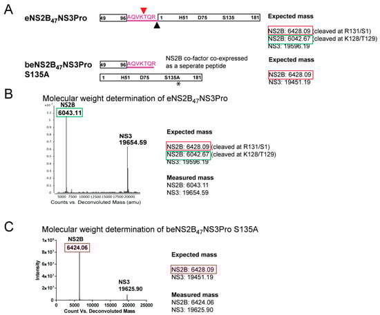 Molecular weight determination of active and inactive DENV4 NS2B47NS3 proteases. (A) The construct design of eNS2B47NS3Pro and beNS2B47NS3Pro S135A and the expected molecular weights of the peptides. The mutation, S135A, on beNS2B47NS3Pro is indicated in asterisk. (B) Deconvoluted mass spectra of eNS2B47NS3Pro. The mass of NS2B peptide is lower than the expected mass indicating the truncated form. (C) Deconvoluted mass spectra of beNS2B47NS3Pro S135A. The measured mass of NS2B peptide reflects the un-truncated form of NS2B in the absence of the protease activity.