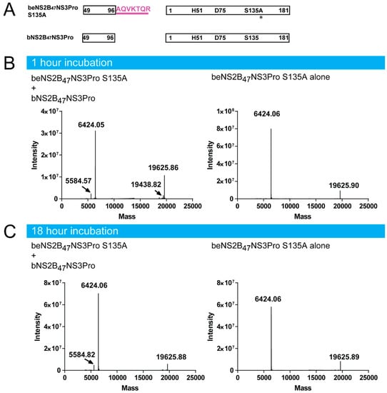 To determine if the second cleavage of NS2B terminus happens in trans, we incubated the beNS2B47NSPro S135A with active protease bNS2B47NS3Pro in 10:1 ratio at two time points, 1 h and 18 h (Figure 3A–C). The masses of the proteins were subsequently measured by intact protein LC-MS. The analysis showed that no cleavage of NS2B from beNS2B47NS3Pro S135A was detected, while we could detect the truncated NS2B from bNS2B47NS3Pro in lower intensity (Figure 3B,C). These results confirm that the second cleavage of NS2B C-terminus is mediated exclusively via cis-cleavage of NS2B-NS3 protease.