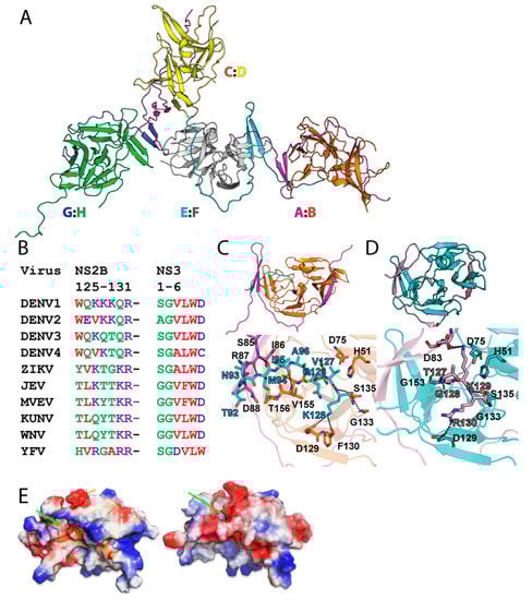 - Assenberg, R.; Mastrangelo, E.; Walter, T.S.; Verma, A.; Milani, M.; Owens, R.J.; Stuart, D.I.; Grimes, J.M.; Mancini, E.J. Crystal Structure of a Novel Conformational State of the Flavivirus NS3 Protein: Implications for Polyprotein Processing and Viral Replication. J. Virol. 2009, 83, 12895–12906. [Google Scholar] [CrossRef]