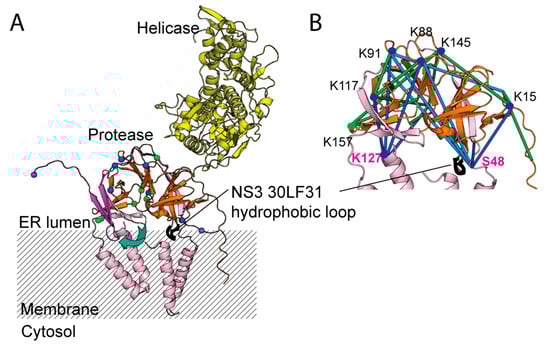 To map the interaction of post cleaved NS2B-NS3 protease with full length NS2B-NS3, we predicted the 3D model of full length NS2B-NS3 full length using AlphaFold2. The identified cross-links can be mapped to the predicted model with more than 80% cross-links within 30Å ± 3Å Cα-Cα distance (Figure 6). Similar to the crystal structure, the intra-NS3-NS3 cross-links are located away from the ER membrane exposed side of NS3 protease (Figure 6A,B). Previous studies have mentioned that NS3 protease is anchored to the membrane by a loop with two hydrophobic leucine and phenylalanine at residues 30 and 31 [,] (Figure 6A,B). Interestingly, the hydrophobic hairpin loop comprising residues L3031F is located on the β-barrel 1 with fewer cross-linking interactions (Figure 6A,B).