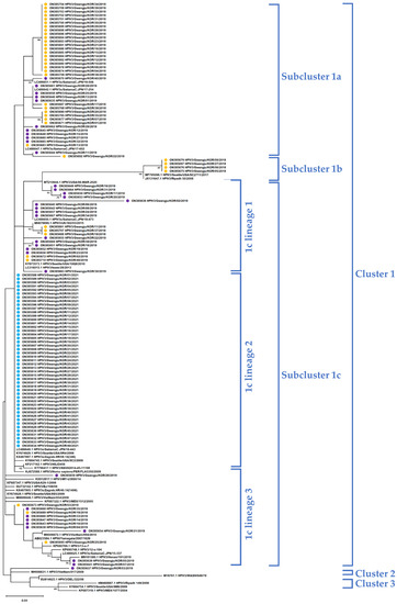The phylogenetic tree of the F coding region was also constructed with 123 nucleotide sequences and aligned according to the same methods and criteria as for HN gene analysis. For the F gene, two clusters were identified. Cluster 1 was further subdivided into subclusters, 1a and 1b, with smaller subdivisions into lineages (Figure 3). All sequences in 2021 were identified as 1a lineage 1 in Subcluster 1a. On the other hand, those in 2018 and 2019 were distributed into clusters and subclusters. The pairwise distances were 0.013 ± 0.015 in 2018, 0.013 ± 0.007 in 2019, and 0.000 ± 0.001 in 2021 (Figure 4b).