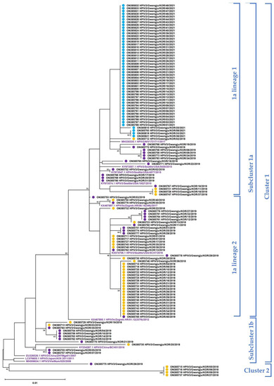 We were able to obtain a total of 123 partial nucleotide sequences for the HN coding region in this study, and these were used to construct a phylogenetic tree together with the reference sequences using the maximum likelihood method. Clusters, subclusters, and lineages were identified using the Tamura 3-parameter model in MEGA X software and a genetic distance of 0.045 (cluster), 0.020 (subcluster), and 0.010 (lineage) were identified [15]. All 123 sequences were identified as Cluster 1, and Cluster 1 was further subdivided into three subclusters, from 1a to 1c. Unlike the sequences from 2018 and 2019 that are divided into subclusters, all sequences from 2021 were identified as Subcluster 1c. Moreover, Subcluster 1c was further divided into two lineages, and in particular, it was confirmed that all strains from 2021 were identified as 1c lineage 1 (Figure 2). In addition, we calculated the pairwise distance among sequences within the same year, and it was confirmed to be 0.012 ± 0.011 in 2018 and 0.013 ± 0.008 in 2019 and no distance among sequences was detected in 2021 (Figure 4a).