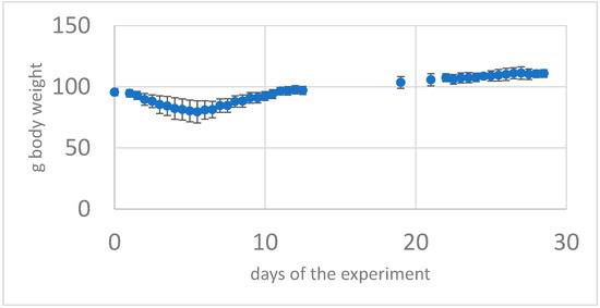 Body weight of the group G4 with a SARS-CoV-2 intranasal primary infection then 21 days later (challenge) as intranasal re-infection with SARS-CoV-2 virus (Mean of n = 7 animals + -standard deviation) From day 2 to day 8 weight loss and recovery after 12 days.