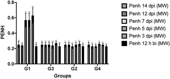 Overall, volumes and flow rates remained stable in all animals regardless of the time point studied. The general trend in hamsters of groups G3 and G4 at primo infection with SARS-CoV-2 was a dramatic increase in Penh levels on the 3rd, 5th, and 7th day post infection and a return to normal on the 12th day after infection. Flow at mid-tidal expiratory volume (abbreviated EF50) is the airflow at mid-volume of each tidal breath during expiration. EF50 remained stable throughout the study period in all infected animals. Shallow and slow flow at end-tidal expiratory volume (abbreviated EEP, standing for end-expiratory pause) is the airflow at the end volume of each tidal breath during expiration. Again, the general trend in hamsters assigned to groups G3 and G4 was an increase in EEP on days 3, 5, and 7 after infection and a return to normal by day 12 after infection. The Penh value 12 h before infection did not show significant differences between animals, so we used this value as a reference for comparison of the whole group throughout the experiment. Penh values at day 12 and 14 after infection showed no significant differences between all groups, indicating functional recovery from lung disease.