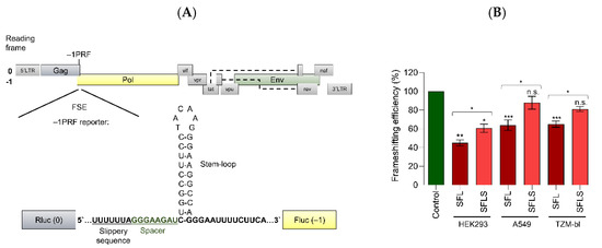 To analyze relative –1PRF efficiency, the cell lines tested were seeded in 48-well plates. The following day, cells were co-transfected with 250 ng/well of –1PRF reporter plasmid psiCHECK-HIV-1 jointly with 250 ng of the pQCXIP expression vector carrying the gene of interest (SFL, SFLS, SFL mutants). To detect potential unspecific effects of SFL, SFLS, and SFL mutants on translation, cells were co-transfected with the positive control psiCHECK-posCTR, which harbors a mutated slippery sequence placing RLuc and FLuc in the same frame, and with pQCXIP expression vectors harboring SFL, SFLS, and SFL mutants, as described above. A pQCXIP vector expressing GFP instead of SFL served as additional control. Transfection was carried out via Lipofectamine 2000 (Thermo Fisher Scientific, Waltham, MA, USA) following the manufacturer’s instructions. At 16 h post-transfection, the culture medium was replaced by fresh medium, and the cells were incubated for an additional 32 h. At 48 h post-transfection, culture medium was removed, and cells were lysed with 200 µL cell culture reagent (Promega, Madison, WI, USA) for 30–60 min at RT. For detection of the RLuc (0 reading frame) activity, 40 µL of each cell lysate was transferred into a white opaque-walled 96-well plate and 40 µL of the in-house-made RLuc substrate (Carl Roth, Karlsruhe, Germany) (dissolved in 137 mM NaCl, 2.7 mM KCl, 10 mM Na2HPO4, 1.8 M KH3PO4) was added. For detection of FLuc (–1 reading frame), FLuc substrate (PJK) was added instead of the RLuc substrate. Luminescence signals were quantified using a plate luminometer (Hidex, Turku, Finland). The background signal (i.e., signal measured for GFP transfected cells) was subtracted, and FLuc signals were normalized against the corresponding RLuc signals. Additionally, the RLuc/FLuc ratio obtained for the –1PRF reporter was normalized against the corresponding RLuc/FLuc ratio obtained for the positive control. Finally, the ratio obtained upon co-expression of GFP was set as 100%. One-way analysis of variance (ANOVA) with Dunnett’s multiple comparison test analysis was performed to test statistical significance (*, p ≤ 0.05; **, p ≤ 0.01; ***, p ≤ 0.001; n = 3). Paired Student’s t-test was performed to test statistical significance between SFL and SFLS (*, p ≤ 0.05; **, p ≤ 0.01; ***, p ≤ 0.001; HEK293, n = 3; A549, n = 10; TZM-bl, n= 8).