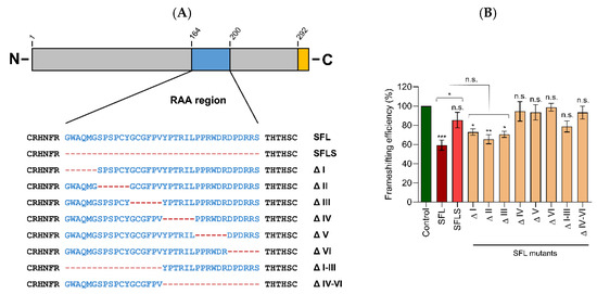 Deletions in the C-terminus of the RAA abrogate inhibition of –1PRF. (A) Sequences deleted from the RAA are shown. A C-terminal antigenic tag added for analysis of protein expression is shown in orange. (B) A549 cells were transfected with plasmids encoding SFL, SFLS, or SFL mutants together with –1PRF reporter vector. Luciferase signals in cell lysates were measured at 48 h post-transfection. A GFP expression plasmid served as a control. The average of five biological replicates conducted with technical triplicates is shown; error bars indicate SEM. One-way analysis of variance (ANOVA) with Dunnett‘s multiple comparison test was performed to determine whether differences between cells expressing GFP (control) and SFL, SFLS, or SFL mutants were statistically significant (not significant [n.s.]; *, p ≤ 0.05; **, p ≤ 0.01; ***, p ≤ 0.001; n = 5). Unpaired Student’s t-test was performed to test whether differences between cells expressing SFL or SFLS and cells expressing SFLS and mutants Δ I, Δ II, or Δ III were statistically significant (not significant [n.s.]; *, p ≤ 0.05; **, p ≤ 0.01; ***, p ≤ 0.001; n = 5). SFL, shiftless; SFLS, shiftless short.