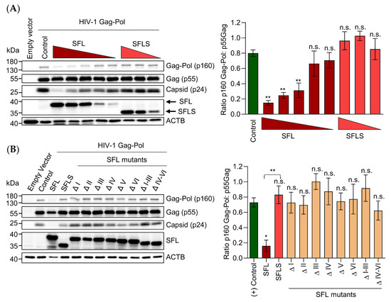 3.3. Deletions in the RAA Reduce the Ability of SFL to Suppress Gag-Pol Expression and HIV Infectivity
