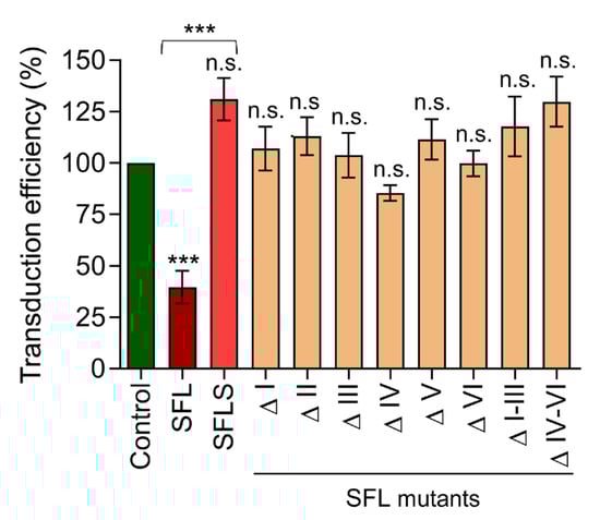 293T cells were seeded in T25 flasks. The following day, cells were transfected with plasmids encoding (i) an HIV-derived vector harboring a Firefly luciferase reporter gene, (ii) HIV Gag-Pol for packaging of the HIV vector, and (iii) the glycoprotein of the vesicular stomatitis virus (VSV-G) together with plasmids encoding for SFL, SFLS, or SFL mutants. A vector expressing GFP instead of SFL served as a control. Calcium–phosphate precipitation was used for transfection. At 12 h post-transfection, medium was replaced with fresh medium. At day three post-transfection, supernatants of transfected 293T cells were collected and cleared from cellular debris by centrifugation at 5000 rpm for 10 min at room temperature. Subsequently, naïve 293T cells seeded in 96-well plates were transduced with the cleared supernatants (quadruplicates, 1:10 diluted). At 48 h post-transduction, culture medium was removed, and cells were lysed with 55 µL cell culture reagent (Promega, Madison, WI, USA) for 30–60 min at RT. For detection of the FLuc activity, 50 µL of each cell lysate was transferred into a white opaque-walled 96-well plate and 50 µL of FLuc substrate (PJK, Kleinbittersdorf, Germany) was added. Luminescence signals were quantified using a plate luminomenter (Hidex, Turku, Finland) and indicate transduction efficiency. Finally, background signal was subtracted and signals measured upon co-expression of GFP were set as 100%.