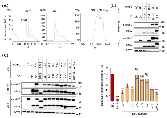 We next studied why deletions in the RAA region interfered with SFL antiviral activity. Previous studies suggested that SFL forms multimers and that multimerization might be required for inhibition of –1PRF [4]. Size exclusion chromatography experiments with recombinant SFL revealed that SFL (monomer size 33 kDa) eluted from the gel filtration column earlier than two larger control proteins, EF-G (77 kDa) and EF-Tu (43 kDa), suggesting that SFL forms oligomers. This effect could be reversed by treatment with 6 M urea, which should disrupt oligomerization and cause partial protein unfolding; the latter may explain the multiplicity of protein peaks observed in the presence of 6 M urea (Figure 5A, right panel). To further investigate whether SFL forms oligomers, we employed co-immunoprecipitation. SFL, SFLS, or SFL deletion mutants carrying HA- or MYC-tags were co-expressed in HEK293T cells, followed by immunoprecipitation with anti-HA antibody and detection of binding partners with anti-MYC antibody. We first examined whether homotypic SFL–SFL and SFLS–SFLS, as well as heterotypic SFL–SFLS, interactions could be detected by immunoprecipitation. SFL co-precipitated with SFL and SFLS, while SFLS did not co-precipitate SFLS, although both proteins were readily detectable in whole cell lysates (WCL) and were pulled down by the anti-HA antibody (Figure 5B,C, upper panel, anti-HA). We then analyzed homotypic interactions between SFL deletions mutants. All SFL deletion mutants were able to self-interact (Figure 5C), although with somewhat different efficiency. Deletions of blocks of six amino acids in the N-terminal portion and removal of the N- or C-terminal 18 amino acids of the RAA region reduced homotypic interactions by~40 to 60% (Figure 5C). In contrast, deletions of blocks of six amino acids in the C-terminal part had no appreciable effect (Figure 5C).
