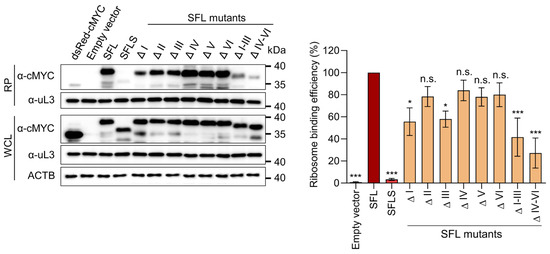 Effect of RAA deletions on ribosome binding. HEK293T cells were transfected with plasmids encoding SFL, SFLS, and the indicated SFL variants equipped with a C-terminal MYC antigenic tag. At 48 h post-transfection, cells were lysed and WCL was loaded on a sucrose cushion and centrifuged for 60 min at 100,000 rpm at 4 °C. The ribosomal pellet (RP) and WCL were analyzed by immunoblot using anti-MYC antibody. The large ribosomal subunit protein uL3 served as a loading control. A representative blot is shown in the (left panel); irrelevant lanes were excised. Up to five replicates were quantified by the software ImageJ, and the cMYC signals in RP and WCL were normalized against the corresponding uL3 signals and the ratio of cMYC signals in RP versus WCL was calculated (right panel). The ratio obtained for SFL was set as 100%. The average of four (mutants ΔI, ΔII, ΔIII, ΔIV, ΔV, ΔVI) or five (SFL, SFLS, Δ I–III, Δ IV–VI) independent experiments is shown; error bars indicate standard error of the mean (SEM). One-way analysis of variance (ANOVA) with Dunnett’s multiple comparison test was performed to determine whether differences between cells expressing SFL, SFLS, SFL mutants, or empty vector were statistically significant (not significant [n.s.]; *, p ≤ 0.05; ***, p ≤ 0.001; n = 5). SFL, shiftless; SFLS, shiftless short; WCL, whole cell lysate.