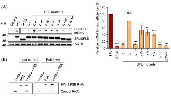 Deletions in the N-terminus of the RAA abrogate SFL binding to the HIV FSE. (A) HEK293T cells were transfected with plasmids encoding SFL, SFLS, or the indicated SFL mutants equipped with a C-terminal MYC-tag. A plasmid encoding GFP served as negative control. At 48 h post-transfection, the cells were lysed, fluorescence labeled HIV-1 FSE mRNA was added to cell lysates, and proteins were precipitated with anti-MYC antibody. Co-precipitated HIV-1 FSE mRNA was loaded on a urea gel and the subsequent fluorescence signal was quantified. Expression of SFL, SFLS, and SFLS mutants in WCL was confirmed via immunoblot using anti-MYC antibody. β-Actin (ACTB) expression in WCL served as a loading control. A single representative blot is shown in the left panel; irrelevant lanes were excised. Three biological replicates were quantified by the software ImageJ (right panel). SFL, SFLS, or SFL mutants were normalized to ACTB and in turn used for normalization of HIV-1 FSE mRNA signals. RNA signal measured upon precipitation of SFL was set as 100%. The average of three independent experiments is shown; error bars indicate the standard error of the mean (SEM). One-way analysis of variance (ANOVA) with Dunnett’s multiple comparison test was performed to determine whether differences between cells expressing SFL and SFLS or SFL mutants were statistically significant (not significant [n.s.]; **, p ≤ 0.01; ***, p ≤ 0.001; n = 3). (B) HEK293T cells were transfected with plasmid encoding SFL with a C-terminal MYC antigenic tag and WCL were prepared. Subsequently, WCL were incubated with an equimolar mixture of fluorescently tagged HIV-1 FSE mRNA and a control mRNA containing multiple secondary structures. Competitive protein–RNA binding was analyzed via urea–PAGE as described above (right panel). Input control mRNA, HIV-1 FSE mRNA, and a mixture of both are shown in the left panel. The results of a representative experiment are presented and were confirmed in two independent experiments. SFL, shiftless wild type; SFLS, shiftless short; FSE, frameshifting stimulation element; WCL, whole cell lysate.