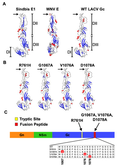 We demonstrated that the proximal two-thirds of Gc, amino acids 860-1442, are critical in LACV fusion and entry [21,23,24]. Using computational analysis, we identified structural similarities within this region of LACV Gc (amino acids 970-1350) to the E1 fusion protein of two alphaviruses, Sindbis virus and Semliki Forrest virus (SFV) [23,25]. Collectively, these studies determined that LACV Gc functions as a class II membrane fusion protein, akin to the alphavirus E1 glycoprotein and the flavivirus E glycoprotein (Figure 1A). Furthermore, a 22-amino acid hydrophobic segment (1066-1087) within the aforementioned proximal two-thirds was predicted to correlate structurally with a hydrophobic domain of Semliki Forrest virus (SFV) and Sindbis virus [23,25]. Importantly, this region is highly conserved among the Bunyavirales and the placement of its cysteine residues resembles those of the fusion domains of SFV E1 and sarcoma-leukosis virus E, where the cysteine resides form an internal loop [26]. Using site-directed mutagenesis of conserved residues within LACV Gc 1066-1087, we created mutant M-segment constructs to demonstrate that LACV Gc 1066-1087 functions as the LACV fusion peptide in a luciferase-based, cell-to-cell fusion assay, and in a pseudotype transduction assay [27]. From this panel of M-segment constructs, we generated recombinant LACVs (rLACVs) with mutations in the fusion peptide domain using a three-cDNA plasmid, reverse-genetics system [28]. Five rLACVs were rescued: three with mutations within the fusion peptide domain (G1067A, V1076A and D1078A) (Figure 1B,C), one with a mutation in a site highly susceptible to digestion with trypsin outside the fusion peptide domain (R761H, site not shown), and a control recombinant with the wild-type (WT) LACV sequence. The fusion peptide domain mutant rLACVs (G1067A, V1076A, and D1078A) were growth-impaired in muscle cells, insect cells, and primary rat neuronal cultures and had diminished fusion phenotypes. However, the fusion peptide mutant rLACVs remained as neurotoxic as WT virus in a cell-based, microtubule associated-protein-2 (MAP-2, a neuronal marker) ELISA, using neuronal cultures prepared from embryonic day 17 Sprague Dawley rat pups, despite impaired growth and fusion of these viruses [28]. These data suggested that the LACV fusion peptide is associated with properties of neuroinvasion (growth to high titer in muscle cells and robust fusion), but not of neurovirulence [28].