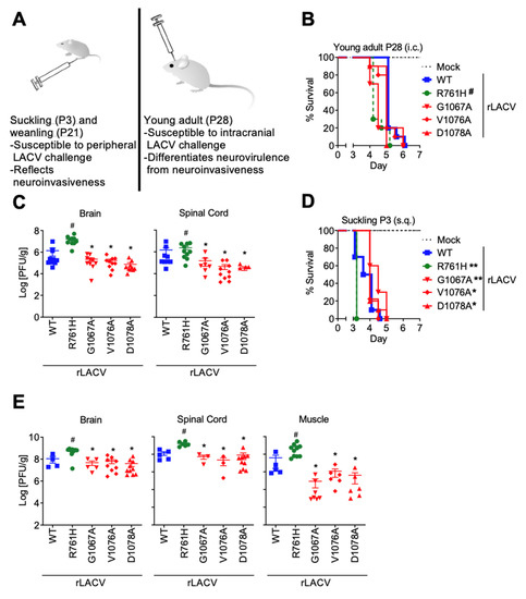 Fusion peptide mutant rLACVs have lower viral loads in key tissues and are less neuroinvasive, but remain neurovirulent in vivo. (A) The murine model of LACV encephalitis differentiates determinants of neuroinvasion from neurovirulence. (B) Four-week-old mice were inoculated intracranially with 10 PFU of rLACV-WT, the tryptic site mutant (rLACV-R761H), or the fusion peptide domain mutants rLACVs (G1067A, V1076A, and D1078A). There were no significant differences in the survival rates of young adult (P28) mice inoculated with rLACV-WT compared to those inoculated with the fusion peptide mutant rLACVs. Interestingly, young adult (P28) mice inoculated with the tryptic site mutant virus died significantly earlier than mice inoculated with rLACV-WT (Log-rank (Mantel–Cox) test; # p < 0.001; n = 10 per group). (C) Fusion peptide mutant viruses grew to lower titers in the brains and spinal cords of young adult (P28) mice compared to rLACV-WT (* p < 0.05). The tryptic site mutant rLACV grew to higher titers in the brains and spinal cords (# p < 0.05 increase). (D) Suckling (P3) mice were inoculated subcutaneously with 5 PFU of the rLACVs (n = 10 per group, except n = 9 for V1076A). Suckling (P3) mice challenged with the fusion peptide mutant viruses (rLACV-G1067A, rLACV-V1076A, and rLACV-D1078A) survived longer than those inoculated with rLACV-WT. As with the young adult (P28) mice, suckling (P3) mice challenged with the tryptic site mutant rLACV-R761H died significantly earlier than mice inoculated with rLACV-WT (Log-rank (Mantel–Cox) test; * p < 0.05; ** p < 0.01). (E) Fusion peptide mutant rLACVs grew to lower titers in the brains, spinal cords, and muscle of suckling mice challenged subcutaneously (* p < 0.05; # p < 0.001).