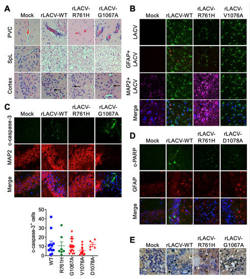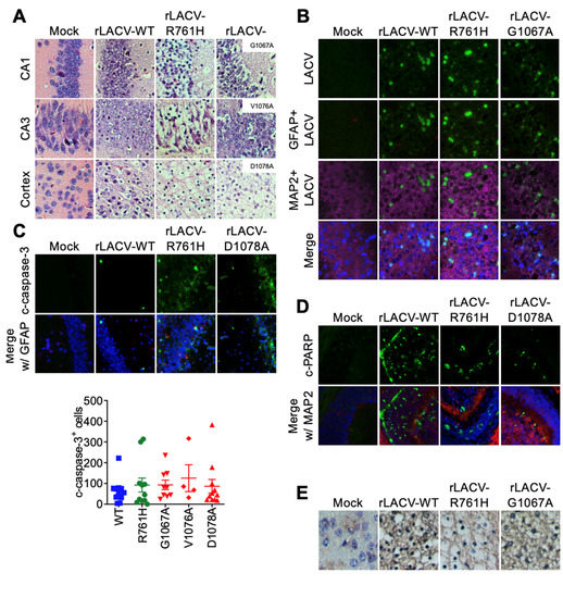 Histologic examination was limited to the brains of moribund mice to compare lesions produced in the CNS due to rLACV infections. In young adult (P28) mice challenged intracranially with rLACVs, perivascular cuffing was present in the brains of mice inoculated with rLACV-WT and the fusion peptide domain mutants (rLACV-G1067A, rLACV-V1076A, and rLACV-D1078A; rLACV-G1067A shown as a representative example) (Figure 3A). Interestingly, there was minimal perivascular cuffing in mice challenged with the tryptic site mutant (rLACV-R761H) (Figure 3A). Additionally, all rLACVs resulted in spongiform lesions in the brain though the size and locations of these lesions varied (Figure 3A). The cerebral cortex of rLACV infected young adult (P28) mice showed only sparse neuronal degradation (Figure 3A,E). Colocalization of LACV antigen with MAP2 (a neuronal marker) demonstrated that the rLACVs primarily infected neurons, but not astrocytes (GFAP; an astrocyte marker), of the hippocampus, thalamus, hypothalamus, and midbrain with more dispersed LACV antigen in the cortex of mice challenged with rLACVs (Figure 3B). The finding that neurons are the primary targets of LACV in the brain is consistent with previous reports [33]. Cleaved-caspase-3 (Figure 3C) and cleaved-PARP (Figure 3D) were present in the brains of moribund mice with dispersed staining in similar regions to where LACV antigen was present, as were TUNEL-positive cells (Figure 3E), indicating widespread neuronal death. Notably, cleaved-caspase 3 is not always associated with death in neurons. However, the presence of cleaved-caspase-3, cleaved-PARP, and TUNEL staining is suggestive of neuronal apoptosis [34].