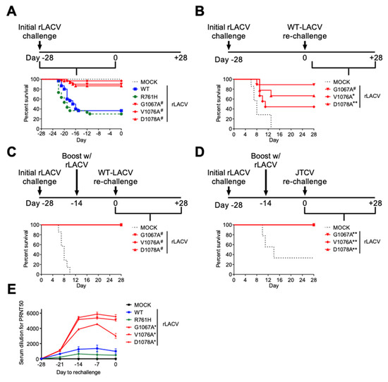 Fusion peptide domain mutant rLACVs are less neuroinvasive and protect against subsequent WT-LACV rechallenge. (A) Three-week-old mice were inoculated intraperitoneally with 1000 PFU of rLACV-WT, the tryptic site mutant (rLACV-R761H), or the fusion peptide domain mutant rLACVs (G1067A, V1076A, and D1078A). The mice challenged with the fusion peptide domain mutants had a significantly increased survival rate compared to rLACV-WT (Log-rank (Mantel–Cox) test; n = 30 per group). (B) Three-week-old mice infected with 1000 PFU were challenged 28 days after rLACV inoculation with 100*LD50 of WT-LACV intraperitoneally. Mice infected with rLACV-G1067A were almost fully protected and mice infected with rLACV-V1076A or rLACV-D1078A were partially protected from lethal WT-LACV challenge. (C,D) Three-week-old mice immunized with 1000 PFU of rLACVs were boosted with 1000 PFU of the same rLACV 14 days following initial rLACV challenge. Fourteen days following rLACV boosts, the mice were challenged with 100×LD50 of (C) WT-LACV or (D) Jamestown Canyon virus intraperitoneally. Mice immunized and boosted with the fusion peptide domain mutant rLACVs were fully protected from lethal WT-LACV or Jamestown Canyon virus rechallenge. (* p < 0.05; ** p < 0.01; # p < 0.001; Log-rank (Mantel–Cox) Test). (E) Neutralizing antibodies measured by PRNT50.