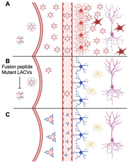 Model of neuroprotection for rLACV rechallenge. (A) WT LACV or WT rLACV robustly replicates in muscle resulting in viremia. Virus enters the CNS causing neurologic disease characterized by neuronal damage, reactive astrocytes, and activated microglia. (B) Fusion peptide mutants rLACVs replicate to a lower level in muscle resulting in less virus in the CNS and decreased neurologic disease. (C) After infection with fusion peptide mutant rLACVs, neutralizing antibodies are produced, which decrease replication of WT LACV in the muscle after rechallenge preventing virus from entering the CNS and preventing neurologic disease.
