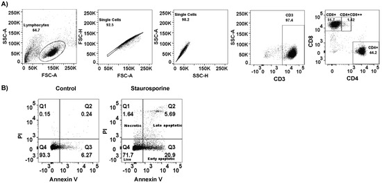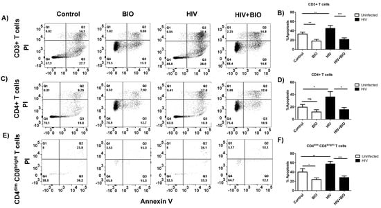 HIV infection induces apoptosis-mediated cell death in CD3+, CD4+, and CD4dimCD8bright T cells. (A,B) PBMCs were cultured in complete RPMI and activated for 3 days in the presence of 30 U/mL IL-2 and then treated with staurosporine (1 µM) for 24 h. (A) Gating strategy for lymphocytes was based on side scatter (SSC-A) versus forward scatter (FSC-A). Doublets were excluded by gating for FSC-A vs. FSC-H then SSC-A vs. SSC-H. T cells were gated on the basis of the surface expression of CD3 and further broken down into CD8 single positive (CD8bright CD4−), CD8 double positive (CD4dimCD8bright), or CD4 single positive (CD4bright CD8−), as shown. (B) General gating strategy to measure apoptosis and/or necrosis by an annexin/PI flow-based assay in each cell population, as shown in representative dot plots. Left to right, control, staurosporine (1 µM). (C–H) Three-day-activated PBMCs were infected with HIVBal for 6 h or left uninfected, washed, and cultured in complete RPMI for 6 days. (C,E,G) Representative dot blots of day six post infection or control (non-infected) cells showing annexin V positive populations in CD3+, CD4+ and CD4dimCD8bright T cells, respectively. (D,F,H) Cumulative data of percent apoptosis (early and late apoptosis) on day six post infection and control in CD3, CD4+ and CD4dimCD8bright T cells populations. n = 4 per treatment. Data are represented as mean ± SEM and analyzed using one-way ANOVA and Newman–Keuls multiple comparisons test. * means p ≤ 0.05, ** p ≤ 0.01.