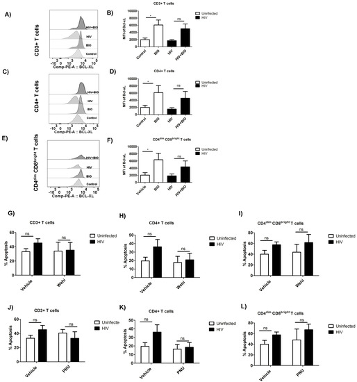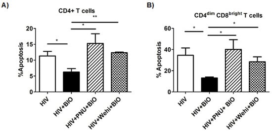 We next evaluated whether the inhibition of Bcl-xL would impact HIV-mediated apoptosis. We used WEHI-539, a specific small-molecule inhibitor of Bcl-xL, which interacts with Bcl-xL binding groove to inhibit its anti-apoptotic action [30]. Treatment with WEHI-539 alone had no effect on the apoptosis rate of infected or uninfected cells (Figure 3G–I). HIV-infected cells treated with BIO and WEHI-539 abrogated the protective effect of BIO restoring the rate of apoptosis to the basal uninfected level in both CD4+ and CD4dimCD8bright T cells (Figure 4A,B).