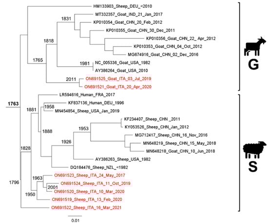 The common ancestor to all viral strains included in the present study (see also Figure 1 for molecular dating of the tree clusters), which could be considered as a proto-ORFV form not yet well-differentiated in the present types S and G ORFV, dates back to the end of 1763. This value represents a molecular dating which is consistent with the first description of contagious ecthyma in European sheep some years later by Steeb in 1787 [2], and in European goats and humans in 1879 [4]. In the present study, types S and G ORFV genome groups are almost coevals (1796 and 1765, respectively), and the rise of these two well-differentiated and contemporary genetic clades may represent a typical case of multiregional geographic origin by evolutive convergence of viral strains in different host species (indeed, identical pathological phenotypes/patterns of clinical lesions are reported for sheep and goats) (see e.g., Sackman et al., 2017 and references therein) [51]. In particular, regarding the type G strains, they may represent the first group of lineages that differentiated, thus suggesting that the early form of ORFV associated with the development of contagious ecthyma originated from viruses infecting goats. Their geographic origin could be tentatively placed in Asia, which currently represents the continent where the highest and the oldest (year 1831) level of genetic variability was evidenced in our analyses.