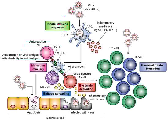 In the bystander activation model, the antiviral immune response induces localized inflammation with the release of self-antigens in the damaged tissue. These are subsequently processed and presented by antigen-presenting cells, such as dendritic cells or macrophages, to enhance the activation of autoreactive T cells during the process of autoimmunity []. By contrast, in epitope spreading, a persistent viral infection is believed to trigger the release of self-antigens, which are not cross-reactive with the virus antigen involved in the original immune response, to activate autoreactive T cells in succession, thereby spreading additional autoreactive epitopes of self-antigens to induce autoimmune response []. Infection by various viruses, including the influenza virus, HIV, herpes simplex virus (HSV), Epstein-Barr (EB) virus, Coxsackievirus, human herpesviruses, hepatitis C virus, Sendai virus, cytomegalovirus (CMV), Dengue virus, and Parvovirus, is closely associated with the onset of an autoimmune disease through the molecular mechanisms leading to autoantigen formation [].