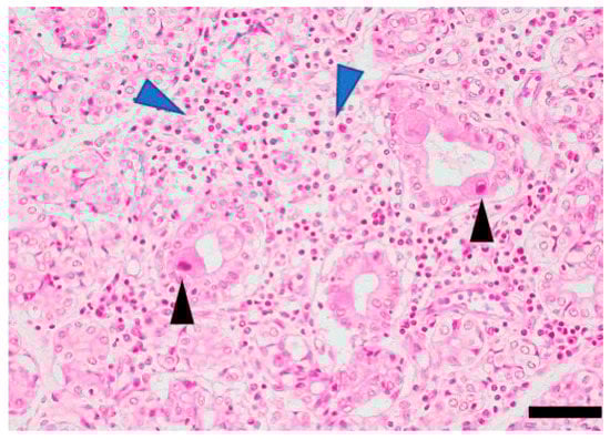 Histopathology of cytomegalovirus (CMV) infection in the salivary gland. HE-stained section of minor salivary glands prepared from lip biopsy. Blue arrowheads indicate inflammatory infiltrates. Black arrowheads indicate intranuclear inclusion bodies. Scale bar: 50 μm. The image is unpublished.