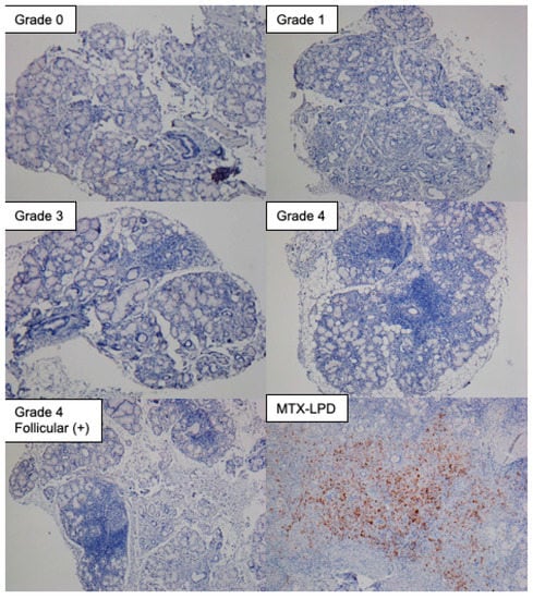 EBNA expression in minor salivary gland tissues from SS and MTX-LPD patients. Samples graded 0 to 4 according to Greenspan grade [,] were used for this analysis. Grade 0 = the absence of lymphocytes and plasma cells per 4 mm2 in labial salivary glands (LSGs), Grade 1 = mild infiltration of lymphocytes and plasma cells per 4 mm2 in LSGs, Grade 2 = a moderate infiltration or less than one focus per 4 mm2 in LSGs, Grade 3 = a single focus per 4 mm2 in LSGs, and Grade 4 = more than one focus per 4 mm2 in LSGs. The stained sample shown was from a gingival mucosa biopsy in a patient with MTX-LPD. Immunohistochemical analysis, performed using paraffin-embedded sections, used FLEX monoclonal mouse anti-EBV, LMP antibody (Clone: CS.1–4, DAKO) as the primary antibody, and SignalStain Boost IHC (horseradish peroxidase: HRP, mouse) (Cell Signaling) as the secondary antibody. EBNA expression was visualized by 3,3-diaminobensidine (DAB) reaction, and counterstaining was performed by hematoxylin. The image is unpublished.
