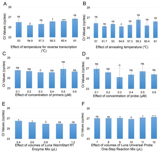 Optimization of the TaqMan RT-qPCR reaction for detection of the coat protein gene of covert mortality nodavirus (CMNV). (A) Effect of temperature for reverse transcription on the TaqMan RT-qPCR reaction. The columns from left to right represent 53 °C, 54.9 °C, 57.3 °C, 59.3 °C, 60.4 °C and 61 °C, respectively. (B) Effect of annealing temperature on the TaqMan RT-qPCR reaction. The columns from left to right represent 51 °C, 51.7 °C, 53 °C, 54.9 °C, 57.3 °C, 59.3 °C, 60.4 °C and 61 °C, respectively. (C) Effect of concentration of primers on the TaqMan RT-qPCR reaction. The columns from left to right represent 0.1 μmol/L, 0.2 μmol/L, 0.3 μmol/L, 0.4 μmol/L, 0.5 μmol/L and 0.6 μmol/L, respectively. (D) Effect of concentration of probe on the TaqMan RT-qPCR reaction. The columns from left to right represent 0.1 μmol/L, 0.2 μmol/L, 0.3 μmol/L, 0.4 μmol/L, 0.5 μmol/L, 0.6 μmol/L, respectively. (E) Effect of volumes of Luna® WarmStart RT Enzyme Mix on the TaqMan RT-qPCR reaction. The columns from left to right represent 0.4 μL, 0.6 μL,0.8 μL,1 μL and 1.2 μL, respectively. (F) Effect of volumes of Luna® Universal Probe One-Step Reaction Mix (2×) on the TaqMan RT-qPCR reaction. The columns from left to right represent 7 μL, 8 μL, 9 μL, 10 μL, 11 μL and 12 μL, respectively. ∆: The best result after optimization. Differences of each group are marked in the figure. ***: p ≤ 0.001, indicating the very significant statistical difference; **: p ≤ 0.01, indicating the significant statistical difference; *: p ≤ 0.05, indicating the statistical difference; ns: p > 0.05, indicating no statistical difference.