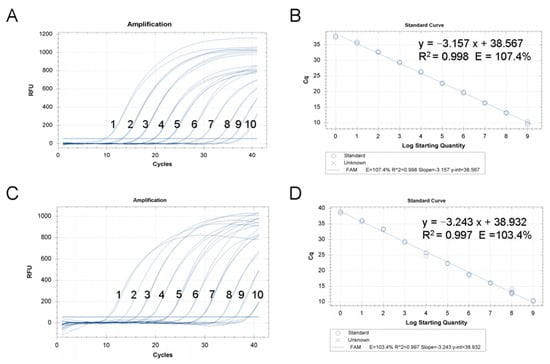 The standard curve of the newly developed covert mortality nodavirus (CMNV) TaqMan RT-qPCR assay. (A) The amplification plots of TaqMan RT-qPCR using serial 10-fold dilutions of the plasmids as templates. 1–10: 2.15 × 109 to 2.15 × 100. (B) Standard curve and standard curve equation for the CMNV TaqMan RT-qPCR assay using plasmids templates. (C) The amplification plots of TaqMan RT-qPCR using serial 10-fold dilutions of the standard RNA templates. 1–10: 1.36 × 109 to 1.36 × 100. (D) Standard curve and standard curve equation for the CMNV TaqMan RT-qPCR assay using RNA templates.