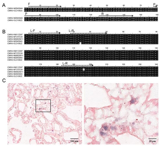 Analysis of the influence of single-base mutation in different covert mortality nodavirus (CMNV) isolate genome sequence on detection methods, and in situ hybridization (ISH) verification of CMNV infection in the discrepant sample detected by new and old methods. (A) Multiple sequence alignment of the targeted RdRp genes from different CMNV isolates, and the locates of primer and probe of Li’s assay (2018). GenBank accession number of the original CMNV isolates’ RdRp gene was KM112247 which was used to design TaqMan RT-qPCR primers and probes in previous Li’s assay (2018); GenBank accession number for CMNV RdRp genes from discrepant samples detected by new method and Li’s assay (2018) were MT270124, MW625911, MZ643943 and OL310822, respectively. Arrows indicate nucleotide sequences of primers and probes. L-F: forward primer of Li’s assay (2018); L-R: reverse primer of Li’s assay (2018); L-P: probe of Li’s assay (2018). (B) Multiple sequence alignment of the targeted CP genes from different CMNV isolates, and the locates of primers and probes of the newly developed TaqMan RT-qPCR assay. F: forward primer; R: reverse primer; P: probe. (C) ISH verification of CMNV infection in the discrepant sample detected by new developed assay and Li’s assay (2018). The sample was detected to be CMNV positive by newly developed assay, while it was detected to be CMNV negative by Li’s assay (2018). The tissue of Figure 4C was from Penaeus vannamei sample and the shrimp showed mild CMNV infection symptoms, such as softening shell and pale hepatopancreas. Note the light purple hybridization signal of the CMNV RNA probe was observed at sites locating hepatopancreatic epithelial cells in the ISH sections. The photo on the right is an enlargement of the boxed area in the picture on the left.