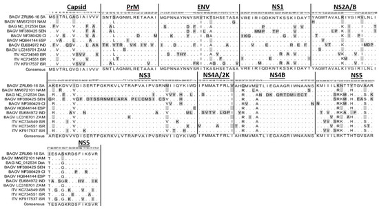 ZRU96-16 (GenBank accession: MW463911) was compared to all other BAGV and ITV full genome sequences available on GenBank using multiple sequence alignments (MSA). A selection of the alignment illustrating only the variant sites across the polyprotein is depicted in Figure 1. In total, seven amino acid variations were identified as being completely unique to ZRU96-16. Two (28.5%) of these differences were found in the structural genes and Five (71.5%) within the non-structural genes. Within the non-structural genes, NS4B and NS5 were the most variant genes, with two unique sites each (Figure 1). The amino acid mutations R2768K and T2973I within NS5 were unique to ZRU96-16, while the G3048S was only present on the South African and Namibian isolates. This was of interest, as NS5 is generally highly conserved. The majority of the amino acid variation was derived from the West African sequences NC102534 and MF380425 or the Indian isolate EU684972 (Figure 1). This was characterized by stretches of unique amino acid sites in Capsid, PrM, NS3 and NS4B.