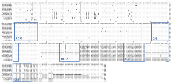 Multiple sequence alignment (MSA) of ITV and BAGV 3′UTR nucleotide sequences. The 3′UTR of ZRU96-16 was compared to a selection of BAGV and ITV 3′UTR segments. The boxes highlighted in blue represent conserved sequence motifs or repeat motifs (R) (CS1-3) that have been identified in other flavivirus UTRs. The region prior to the RCS3 and downstream the stop codon (TAA) is considered to be a variable region in most flaviviruses.