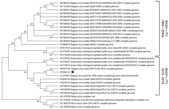 - Fernández-Pinero, J.; Davidson, I.; Elizalde, M.; Perk, S.; Khinich, Y.; Jiménez-Clavero, M.A. Bagaza virus and Israel Turkey meningoencephalomyelitis virus are a single virus species. J. Gen. Virol. 2014, 95, 883–887. [Google Scholar] [CrossRef] [PubMed] [Green Version]