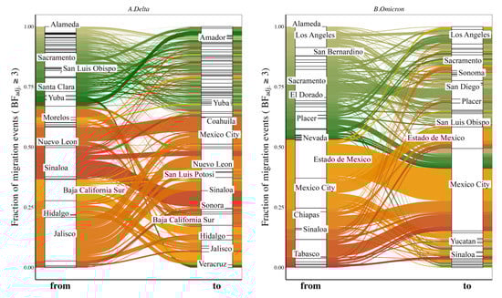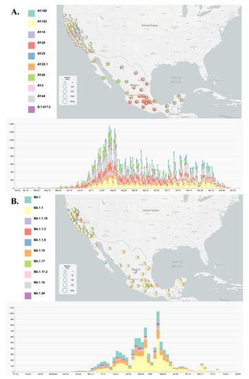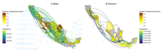 In this study, we use all publicly annotated full-length SARS-CoV-2 sequences available on GISAID (Global Initiative on Sharing All Influenza Data, GISAID public database [12]) as of 31 January 2022 to understand differences in the dispersal of Delta and Omicron across and between Mexico and CA, USA. We focus on these areas because Mexico and the US state of California are tightly linked culturally and commercially. For example, the San Diego–Tijuana land border alone has over 45 million crossings annually [13]. Additionally, as the most populated state in the USA with a robust economy, California also has cultural and economic ties to much of the rest of the world. For this reason, when new pandemics enter the USA (e.g., HIV, H1N1 influenza), California is usually one of the earliest USA states to be affected. Similarly, Mexico City, as an economic and cultural hub with ties across the world, is often impacted early in pandemics.