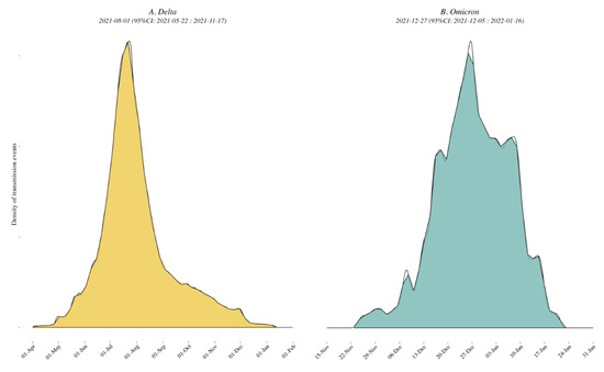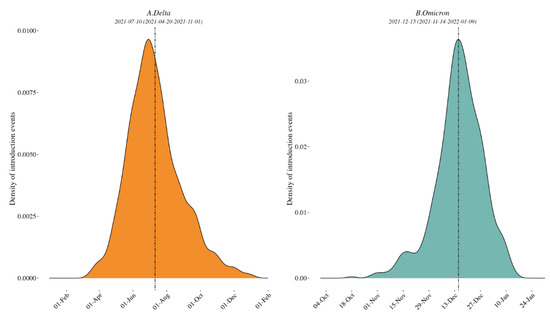 Density plots of external introduction of the identified clades for Delta (A) and Omicron (B) variants. A normal distribution was specified for the evolutionary rate with a mean of 9.41 × 10−4 nucleotide substitutions per site per year and a standard deviation of 4.99 × 10−5 [7]. All 10 replicates are combined to show the timing of the introductions of the clades in the region. See also Supplementary Figure S5 for the results of each of the 10 individual replicates.