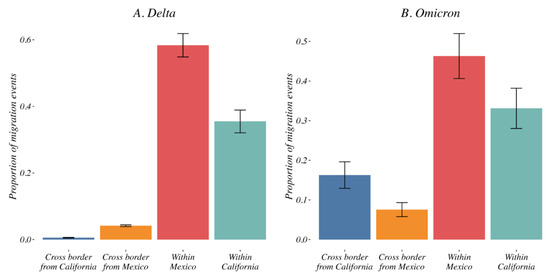 To evaluate the contribution of cross-border variant migration events (i.e., migration from California toward Mexico or from Mexico toward California) to the global dispersal of the Delta and Omicron epidemics, we evaluated the relative contribution of domestic and cross-border viral migrations.