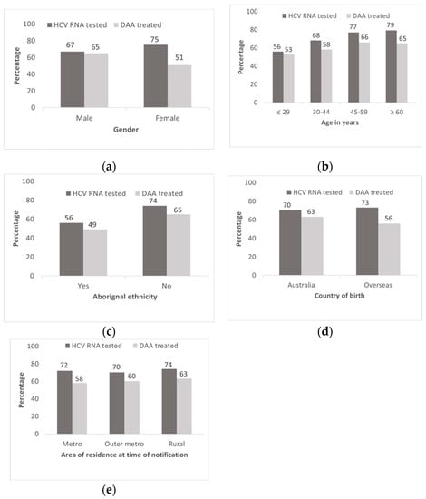 Proportion of HCV RNA testing and DAA treatment by key factors among people with an HCV notification in NSW 2016–2018; (a) gender; (b) age groups; (c) Aboriginal status; (d) country of birth; (e) area of residence.