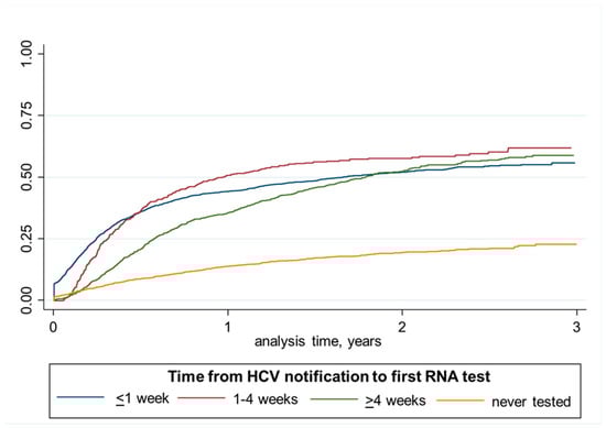 Observation time for HCV RNA testing started from date of HCV notification, and ended on date of HCV RNA testing, date of death, or 31 December of 2018, whichever occurred first. Observation time for HCV treatment started from date of HCV notification or date of 18th birthday if after and ended on the date of treatment initiation, date of death, or 31 December 2018, whichever occurred first. Time from HCV notification to HCV RNA testing was divided into four categories (<1 week, 1–4 weeks, ≥4 weeks, and never tested). Time from HCV notification to HCV treatment was divided into ≤six months, >six months, and never DAA-treated. Associations with time to HCV RNA testing and treatment initiation was assessed using Kaplan–Meier failure curves. Kaplan–Meier failure curves for estimated proportion of DAA treatment were compared among people tested for HCV RNA in <1 week, 1–4 week, ≥4 weeks, and never tested.