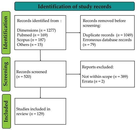 The search for pigeon circovirus-related records conducted in February 2022 yielded 1648 potentially relevant records. After the creation of a unified database of all these records following the format of the Dimensions database, 1049 records were removed as duplicates, while an additional 79 entries were deemed as erroneous database entries from the sources. Therefore, 520 records were screened for eligibility based on the minimal criteria set above, wherein 389 records were determined as out-of-scope, and two others were eliminated as they only contain correction notes of relevant records that were already part of the eligible entries. A diagram of the flow of records through the steps of this review is presented in Figure 1.