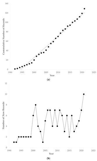 While the first decade of PiCV research saw just a couple of new records per year, remarkable is the first peak in the number of new records (Figure 2b) at the turn of the millennium that saw the first use of polymerase chain reaction for the detection and cloning, and the subsequent sequencing, alignment, and phylogenetic analyses of the PiCV genome [15,16,17,18,19], as well as the first report of pigeon circovirus detection from Africa [20] and Asia [21]. It must be noted that the record of PiCV detection from the African continent [20] was not recovered by our search strategy but was however found during the examination of the texts of the included records. This thereby highlights one of the necessities for this review because this record has also been missed in some of the most recent reviews [22,23,24].