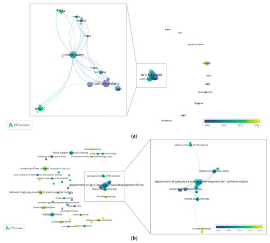 Meanwhile, ranking institutions/organizations by productivity, the Department of Agriculture and Rural Development for Northern Ireland, University of Liege, University of Warmia and Mazury in Olsztyn, Queen’s University of Belfast, University of California, Davis, National Pingtung University of Science and Technology, Leipzig University, the Agri-food and Biosciences Institute in Stormont, and the Robert Koch Institute in Berlin produced the most number of records. Additionally, both the Department of Agriculture and Rural Development for Northern Ireland, and University of Liege are both linked with 10 institutions, while University of Warmia and Mazury in Olsztyn has links with six (Figure 3b). However, when ranked by total link strength, Blood Systems Research Institute and University of California, San Francisco were the two top institutions, each with a total of 30 points. Total link strength is defined as “the total strength of the co-authorship links of a given [organization/institution] with other [organizations/institutions] (p. 5)”, whereas links are defined as “number of co-authorship links of a given [organization/institution] with other [organization/institution] [41]. These observations highlight the central role of the western countries and institutions both in terms of number of record production (in extension, knowledge production), and international institutional collaborations in the field of PiCV research, compared to countries and institutions from other regions.